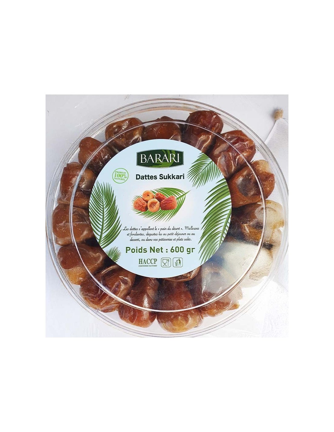 Les dattes Sukari premium sont conditionnées dans une boîte hermétique et transparente de 600 g, garantissant leur fraîcheur et leur moelleux jusqu’à la dernière bouchée.